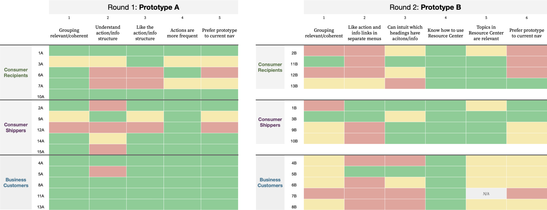 We conducted two rounds of qualitative research to compare the performance of Structure A and Structure B. Each round consisted of 45-minute moderated interviews with customers who represented three key customer personas: shippers, recipients, and business customers.