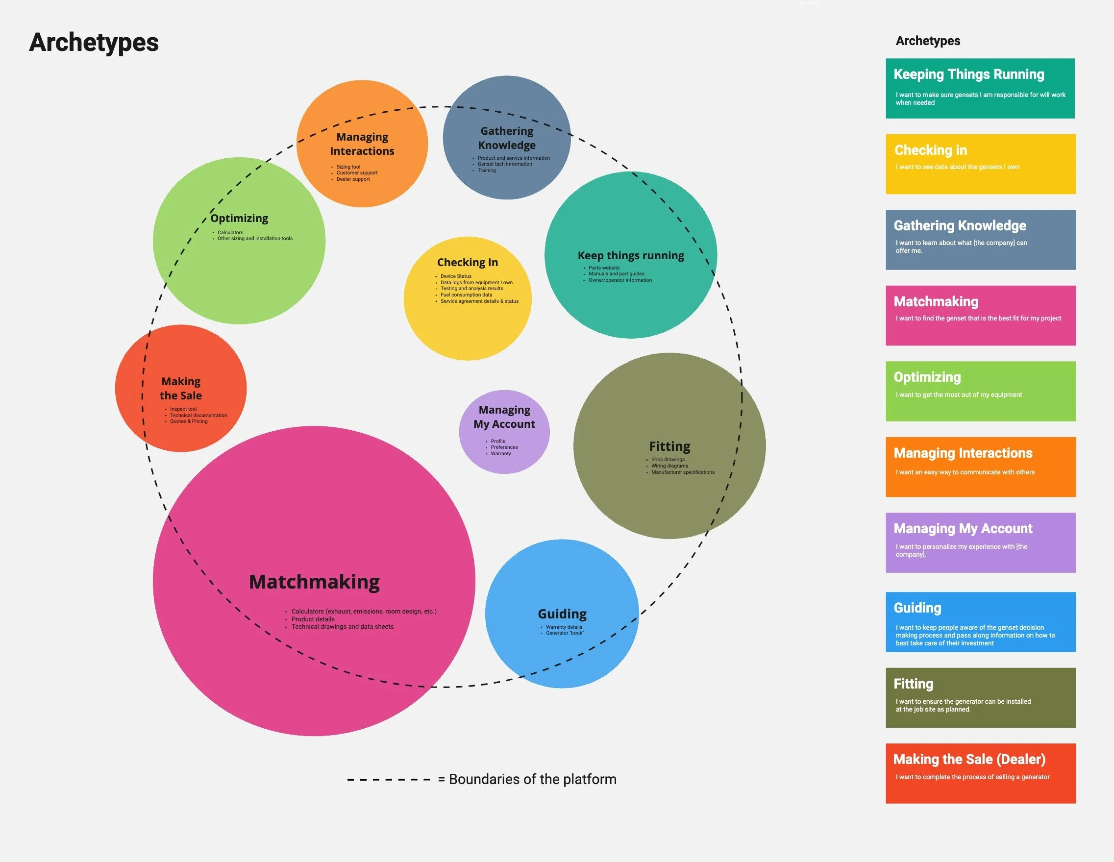 This cartoon-style drawing explains how three different types of user models (personas, jobs to be done, and archetypes) work together to inform the structure of a customer experience platform for diesel generators. I drew this by hand using the Concepts app on my iPad.