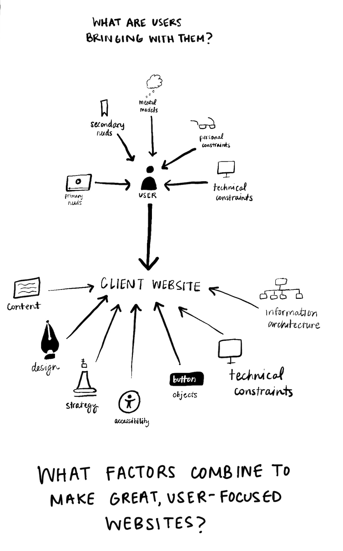This model shows how user constraints and business considerations combine to make an effective, user-centered site. I drew this model using the Concepts app on my iPad to help facilitate a conversation about why a newly-designed website was not testing well with users.